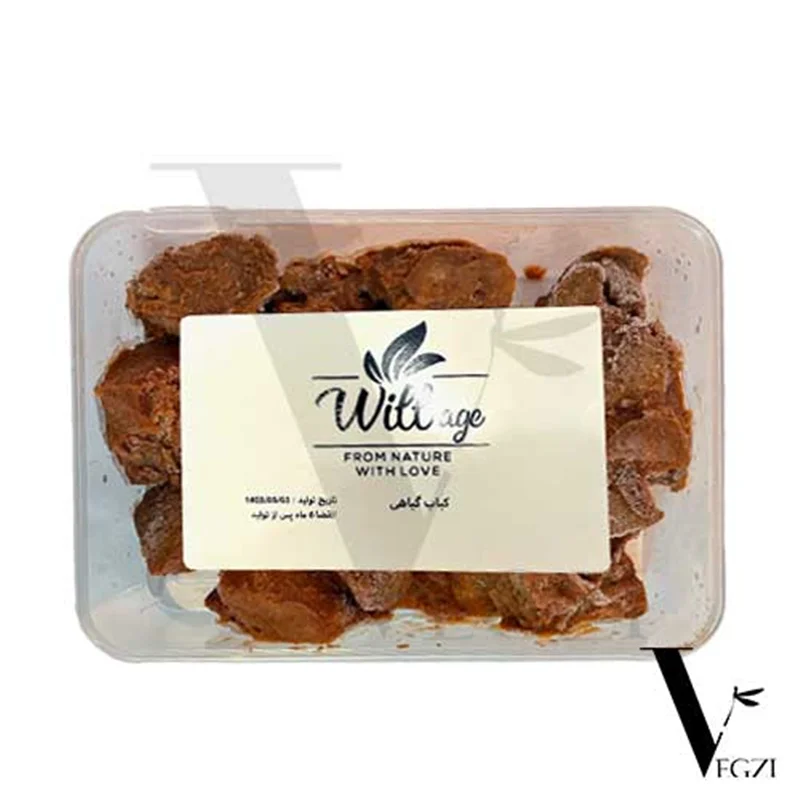 پروتئین گندم، قارچ دکمهای، روغن گیاهی، ارده، ادویه مخصوص، پیاز، سس کباب ترش وگان