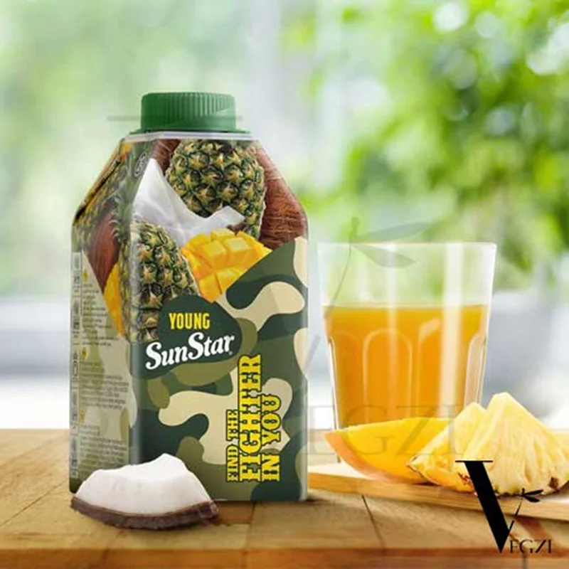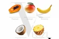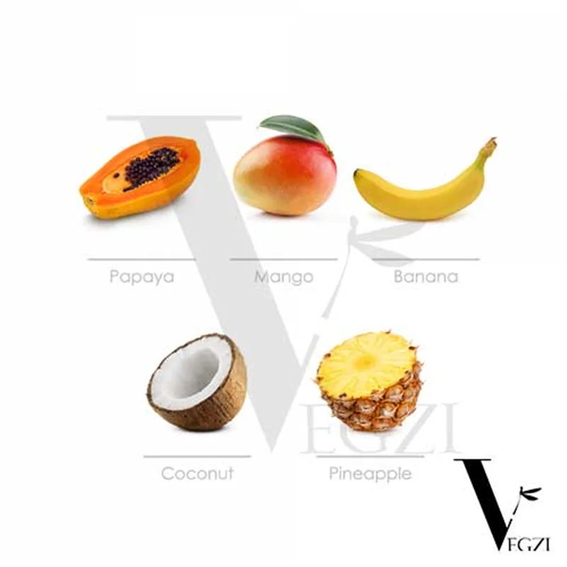 پوره میوههایی مانند انبه، موز، پاپایا و کنسانتره طبیعی میوههایی مانند نارگیل و انبه، شکر، سیتریک اسید E330، آسکوربیک اسید (ویتامین ث) E300 ، آب