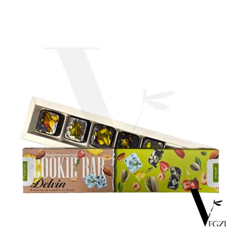 شکلات تلخ 70 درصد، مغز و کرم پسته، آرد سویا، استویا، آرد گندم، کره گیاهی و امولسیفایرها